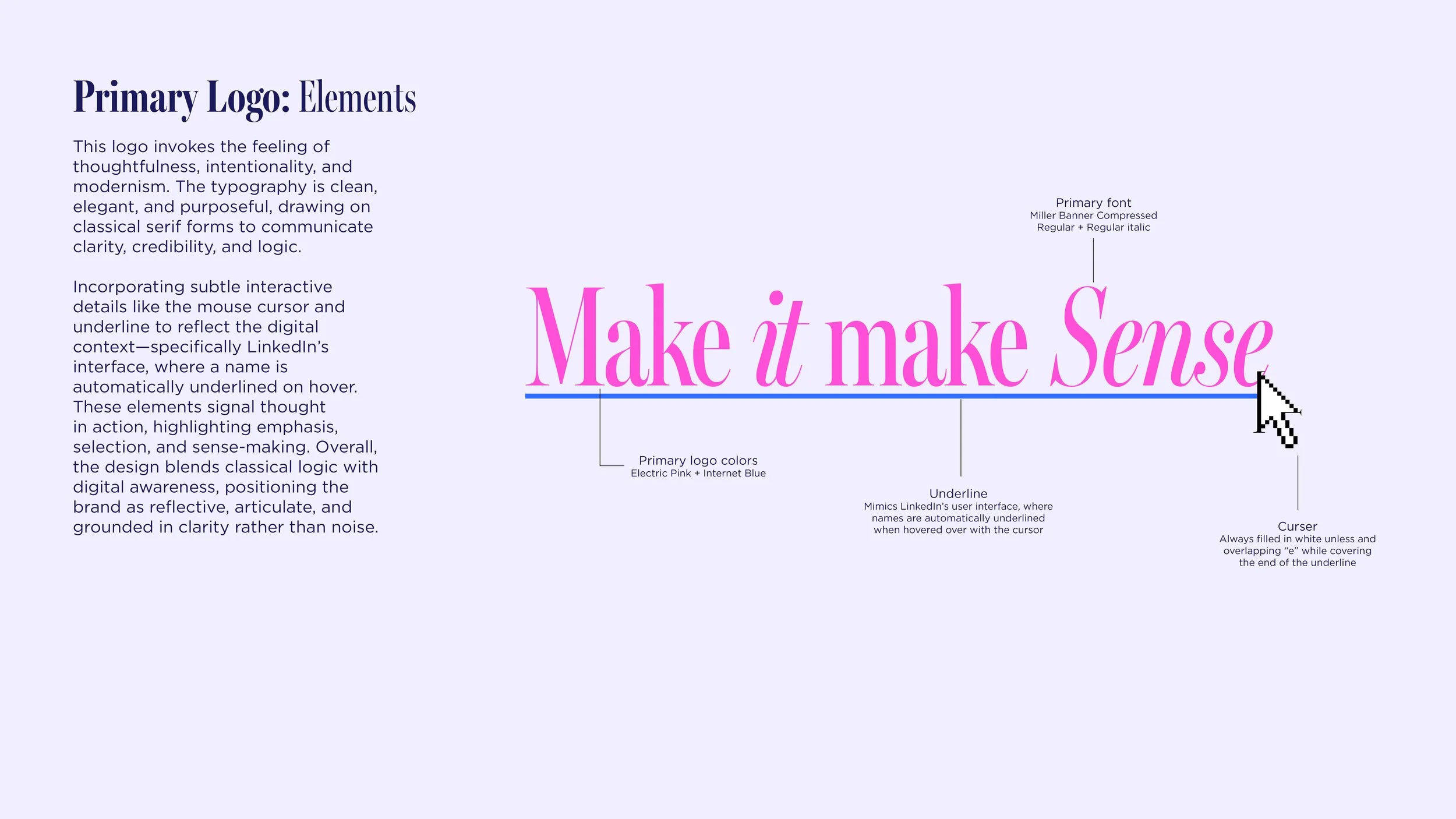The logo evokes thoughtfulness, intentionality, and modernism. Clean, elegant serif typography communicates clarity, credibility, and logic, grounding the brand in an editorial sensibility. I incorporated subtle interactive cues—like a mouse cursor and underline—to reflect the digital environments the audience inhabits, referencing interface behaviors familiar from platforms like LinkedIn. These details suggest thought in motion: emphasis, selection, and sense-making.
